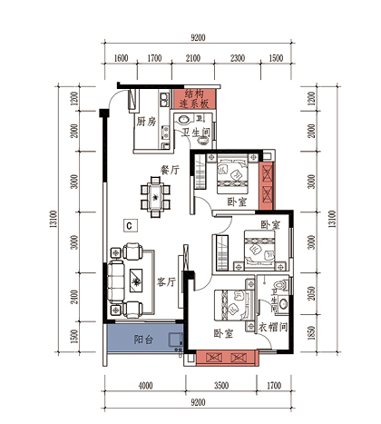 实用三房,科学布局,不浪费每一寸空间 方正厨房紧接餐厅,居家烹饪,纵享美味人生 餐客厅贯通南北,直接阔景阳台,悠享健康生活 尊荣主卧享独立卫浴、衣帽间,宽大观景飘窗,奢享舒阔